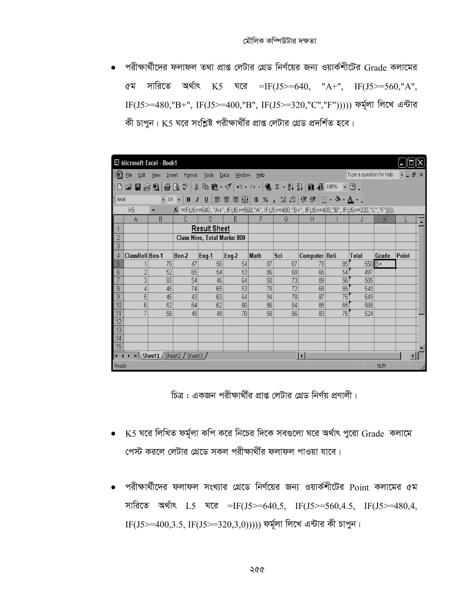 কোনো শিক্ষা প্রতিষ্ঠানে কাজ করতে হলে ছাত্র / ছাত্রীদের পরীক্ষার ফলাফল বের করতে হয়। যদি প্রতিষ্ঠানে অনেক ছাত্র / ছাত্রী থাকে তবে কম্পিউটার ছাড়া সবার ফলাফল বের করা অনেক কষ্টকর এবং অনেক সময়ের কাজ। তাই এই কাজটি খুব সহজে কম্পিউটার দিয়ে করে নেওয়া যায়। আসুন আমরা নিন্মেবর্ণিত ছকের সাহায্যে কি ভাবে খুব সময়ে সূত্র প্রয়োগের মাধ্যমে অনেক ছাত্র / ছাত্রীর পরীক্ষার ফলাফল বের করা যায় তা শিখি।