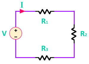 এবার একটা সার্কিট দেখি আমরা, যেখানে একটা ভোল্টেজ সোর্স V এর সাথে তিনটা রেজিস্টর R1, R2 ও R3 সিরিজ কানেকশনে যুক্ত করা-
