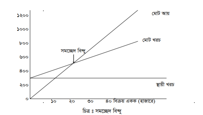 এ চিত্রে দেখা যাচ্ছে, প্রতিষ্ঠান যখন পণ্যের চারটি একক বিক্রি করছে তখনই সমচ্ছেদ বিন্দুতে পৌঁছে গেছে। প্রতিষ্ঠান যত পরিমাণই উৎপাদন ও বিক্রি করুক না কেন, স্থায়ী ব্যয় ২০০ টাকাতেই স্থির থাকছে। একক প্রতি
