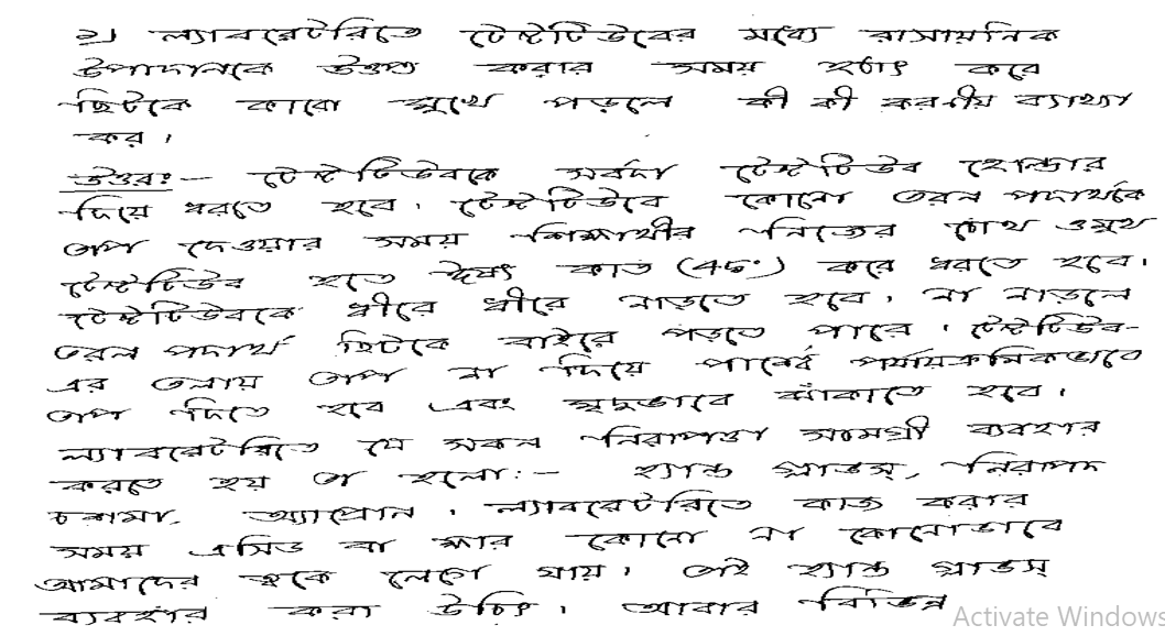 ১। ল্যাবরেটরিতে টেস্টটিউবের মধ্যে রাসায়নিক উপাদানকে উত্তপ্ত করার সময় হঠাৎ করে ছিটকে কারাে মুখে পড়লে কী কী করণীয় ব্যাখ্যা কর।