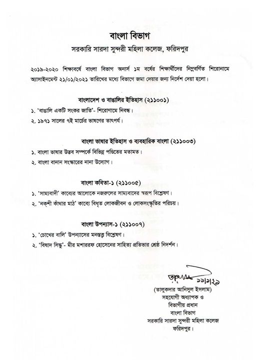 অনার্স ১ম বর্ষ বাংলা অ্যাসাইনমেন্ট। সারদা সুন্দরী মহিলা কলেজ