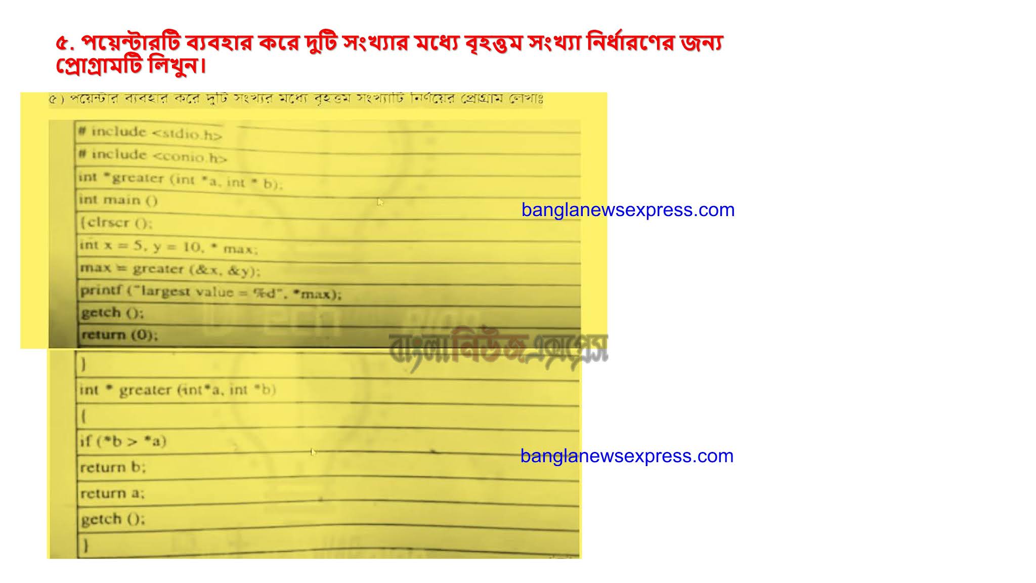 ৫। পয়েন্টার ব্যবহার করে দু’টি সংখ্যার মধ্যে বৃহত্তম সংখ্যাটি নির্ণয়ের প্রােগ্রাম লেখা।