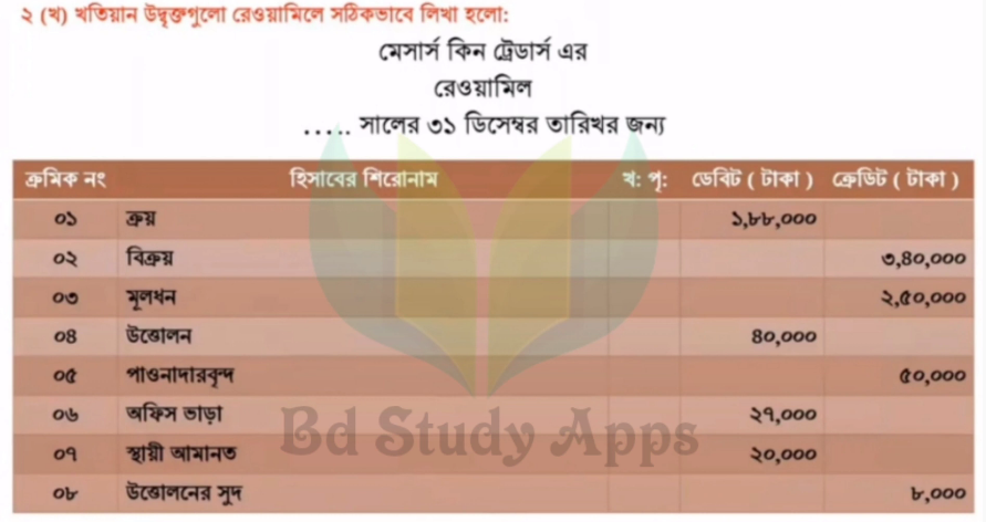 ২. মেসার্স কিন ট্রে ডার্স এর নিম্নোক্ত খতিয়ান উদ্বৃত্তগুলো প্রদত্ত হলঃ ক্রয় ১,৮৮,০০০/-, বিক্রয় ৩,৪০,০০০/-, মূলধন ২,৫০,০০০/-, উত্তোলন ৪০,০০০/-, পাওনাদারবৃন্দ ৫০,০০০/-, অফিস ভাড়া ২৭,০০০/-, স্থায়ী আমানত ২০,০০০/-, উত্তোলনের সুদ ৮,০০০/-, দেনাদারবৃন্দ ৯৫,০০০/-, প্রাপ্ত বাট্টা ৬,০০০/-, উপভাড়া প্রাপ্তি ১২,০০০/-, লভ্যাংশ প্রাপ্তি ২০,০০০/-, ব্যাংক জমাতিরিক্তের সুদ ২,০০০/-, ট্রেডমার্ক ১৫,০০০/-, চালানী কারবারে পণ্য প্রেরণ ১২,০০০/-, বকেয়া অফিস ভাড়া ৪,০০০/-, লগ্নির অনাদায়ী সুদ ২,০০০/-, সমাপনী মজুদ পণ্য ৪৫,০০০/-, অসবাবপত্র ১৮,০০০/-, কলকব্জা ৩০,০০০/-, নিস্কর সম্পত্তি ৮০,০০০/-, ইজারা সম্পত্তি ১,৩৬,০০০/-, প্রারম্ভিক মজুদ পণ্য ২৫,০০০/-।