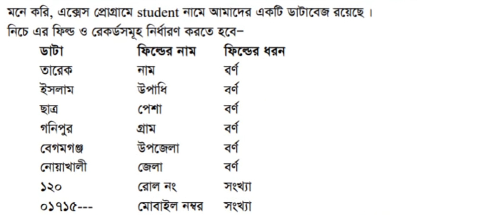 এখানে নাম , উপাধি , পেশা ইত্যাদি হচ্ছে ফিল্ড এবং সবগুলাে ফিল্ডের সম্মিলিত তথ্যগুলাে হলাে রেকর্ড । প্রত্যেকটি ফিল্ডের পাশে বা অধীনে তথ্যের নির্দিষ্ট অংশ লিপিবদ্ধ বা টাইপ করতে হয় । কম্পিউটারে ডাটাবেজ ফাইল তৈরির সময়ে উপরিউক্ত গঠন বা ছক অনুযায়ী ডাটা বা উপাত্ত টাইপ করা যায় । মনে রাখা প্রয়ােজন উপাধি ফিল্ডের নাম , নাম ফিল্ডে উপাধি বা গ্রামের নাম টাইপ করলে ও কম্পিউটার ভুলটি ধরতে পারবেনা ।
