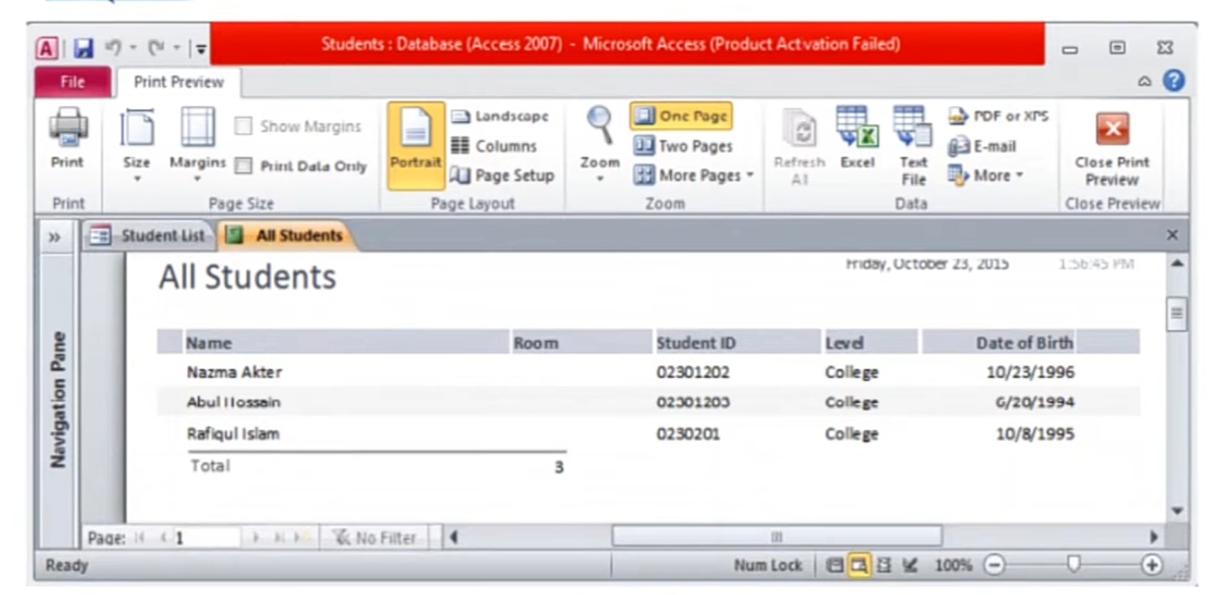 Blank Access database এ ক্লিক করার পর OK এ ক্লিক করার পর New File Database ডায়ালগ বক্স আসবে । সেখানে File name বক্সে বিদ্যালয়ের প্রয়ােজন অনুসারে ফাইলের নাম যেমন Student নামে সংরক্ষণ করতে চাইলে তা টাইপ করতে হবে । এবার Create এ ক্লিক করলে Student নামে একটি ফাইল সৃষ্টি হবে ।