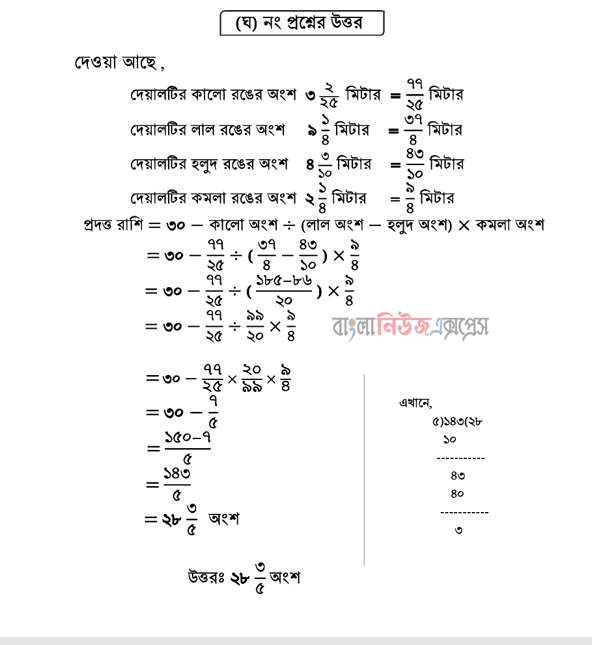 (ঘ) ৩০ – কালাে অংশ = লাল অংশ—হলুদ অংশ ) X কমলা অংশ = কত অংশ হবে, তা নির্ণয় কর।