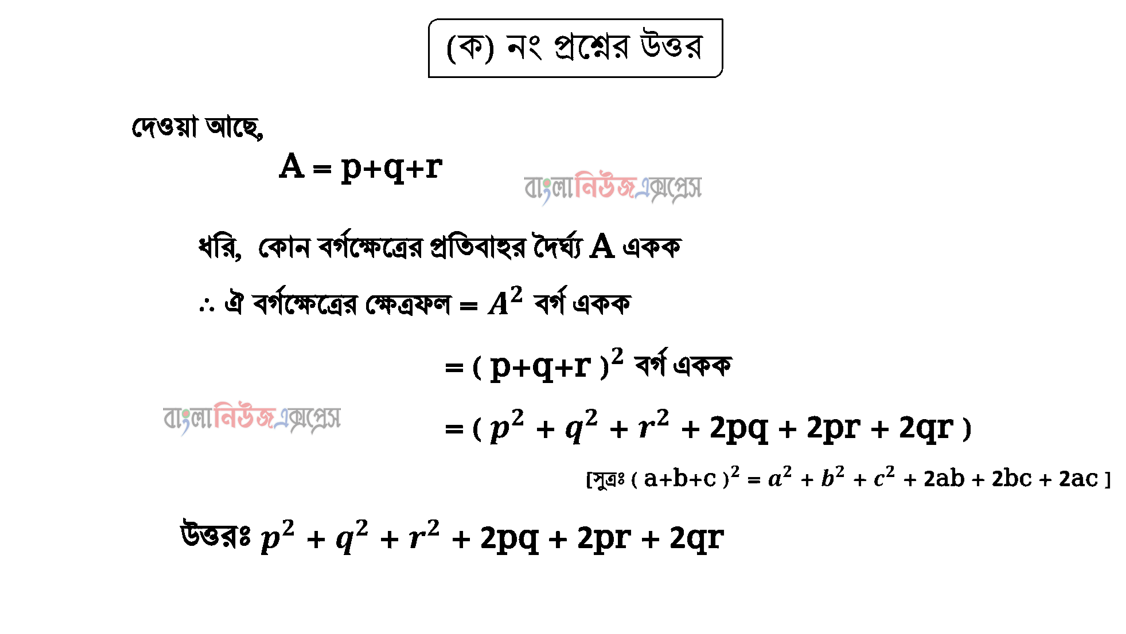 A = p + q + r, a -1/a=1 এবং M = x^2+ x (2a + 5) + (a^2 + 5a + 6) তিনটি বীজ গাণিতের রাশি, A কোন বর্গের প্রতিবাহর পরিমাপ হলে ঐ বগক্ষেত্রে ক্ষেত্রফল নিণয় করো,