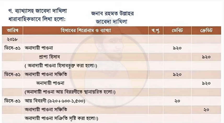 - ১লা জানুয়ারী ২০১৮ অনাদায়ী পাওনা সঞ্চিতি ১,৫০০ টাকা। উক্ত বছরে অনাদায়ী পাওনা হিসাবভুক্ত হয়েছে ৯২০ টাকা।