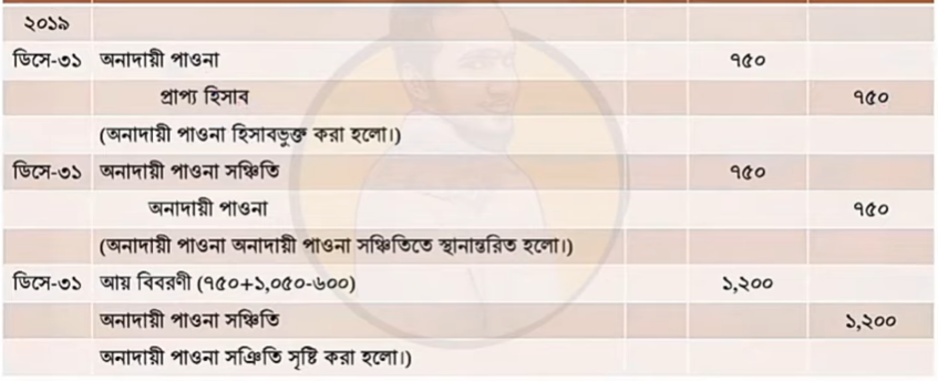 - ২০১৯ সালে অনাদায়ী পাওনা হিসাবভু ক্ত হয়েছে ৭৫০ টাকা। ৩১ ডিসেম্বের ২০১৯ তারিখে প্রাপ্য হিসাবের পরিমাণ ১৫,০০০ টাকা হয়েছিল। প্রাপ্য হিসাবের উপর ৭% ধরে অনাদায়ী পাওনা সঞ্চিতি তৈরি করতে হবে। ২০২০ সালে অনাদায়ী পাওনা হিসাবভুক্ত হয়েছে ২০০ টাকা।
