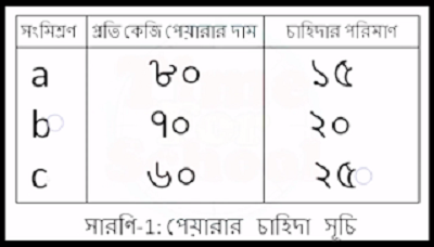 সারণিতে, প্রতি কেজি ৪০ টাকা দমে ভােক্তা প্রতি মাসে ১৫ কেজি পেয়ারা ক্রয় করে, ৭০ টাকা দামে। ২০ কেজি (পয়ারা ক্রয় করে এবং ৬০ টাকা দামে ২৫ কেজি (পয়ারা ক্রয় করে। এভাবে সারণি থেকে দেখা যায়, প্রতি