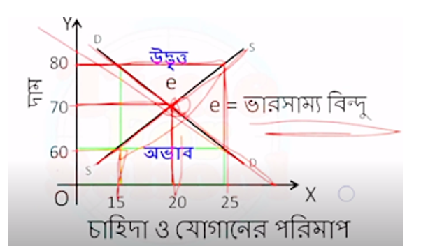 চিত্র ৩ এ বাজার চাহিদা রেখা (DD) ও বাজার যাগান রেখা (SS) পরস্পরকে e বিন্দুতে ছেদ। করেছে। এই e বিন্দুতে বাজার ভারসাম্য বিদ্যমান। ভারসাম্য হচ্ছে এমন একটি অবস্থা যেখানে একটি | নিষ্টি দামে চাহিদার পরিমাণ ও যােগানের পরিমাণ সমতায় পৌঁছে। চাহিদা ও যােগানের। ছেদবিন্দুতে যে দাম বিদ্যমান তা হচ্ছে ভারসাম্য দাম এবং দ্রব্যের পরিমাণ হচ্ছে ভারসাম্য পরিমাণ।