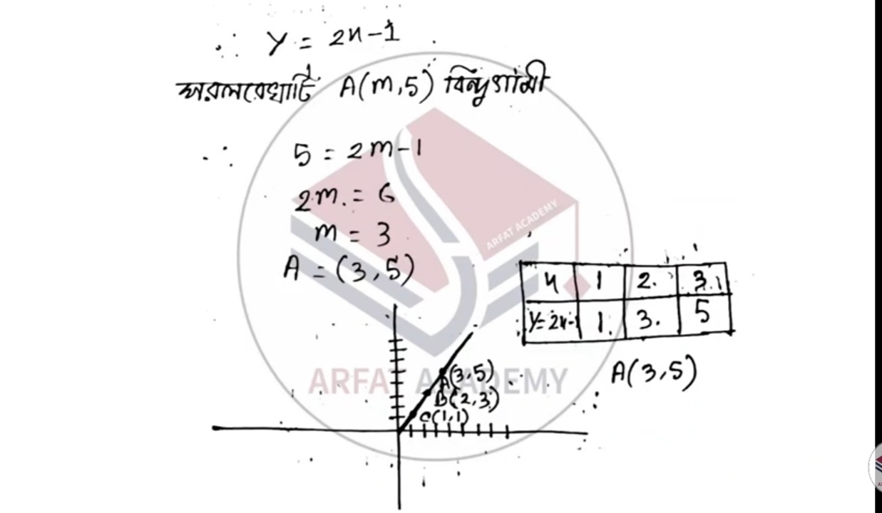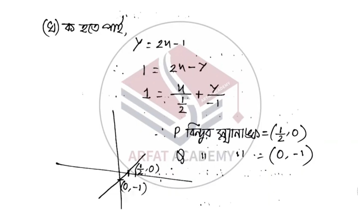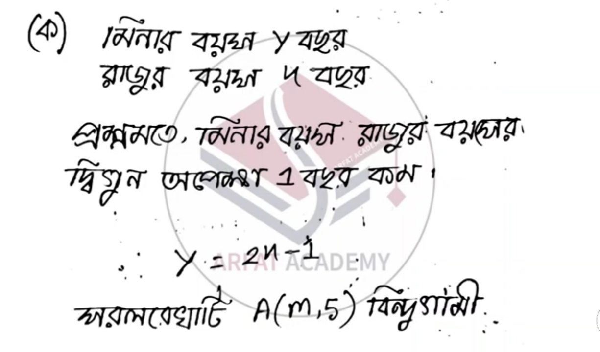 মিনার বয়স রাজুর বয়সের দ্বিগুণ অপেক্ষা 1 বছর কম। মিনার বয়স y বছর ও রাজুর বয়স ৫ বছর এবং তাদের বয়সের সম্পর্ক একটি সমীকরণ দ্বারা প্রকাশ করা যায়। x ও y কে চলক বিবেচনা করে সমীকরণটি থেকে যে সরলরেখা পাওয়া যায় উক্ত সরলরেখার উপর A(m,5) একটি বিন্দু। সরলরেখাটি x ও y অক্ষদ্বয়কে যথাক্রমে P ও Q বিন্দুতে ছেদ করে।