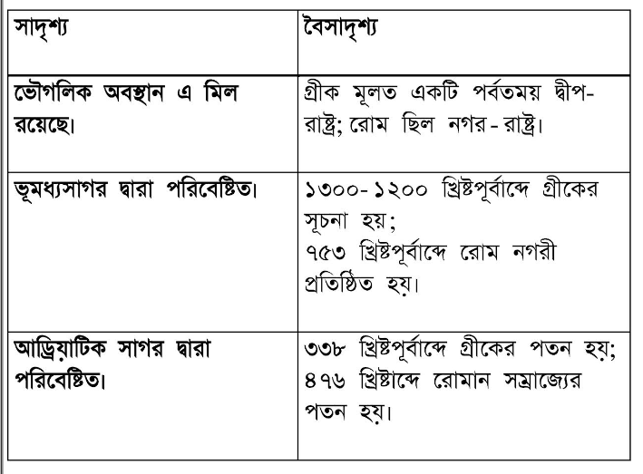 - সাদৃশ্য বৈসাদৃশ্য ছকে উপস্থাপন; শিক্ষা, সাহিত্য ও দর্শনে গ্রিক ও রােমান সভ্যতার তুলনামূলক বৈশিষ্ট্য উপস্থাপন ;