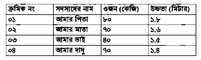 নিন্মের ছকের মাধ্যমে আমার পরিবারের সদস্যদের নাম, ওজন ও উচ্চতা লিপিবদ্ধ করে ছকের মাধ্যমে উপস্থাপন করা হলোঃ
