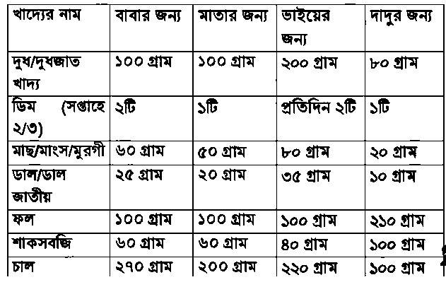 খাদ্য গ্রহণ সংক্রান্ত পরামর্শ তালিকাঃযেহেতু বিএমআই অনুযায়ী আমার বাবার ওজন সঠিক, আমার মাতার ওজন বেশি, আমার ভাই এর ওজন কম এবং আমার দাদুর স্থুলতা তাই তাদের জন্য খাদ্যগ্রহণ তালিকা প্রস্তুত করে নিন্মে উপস্থাপন করা হলঃ